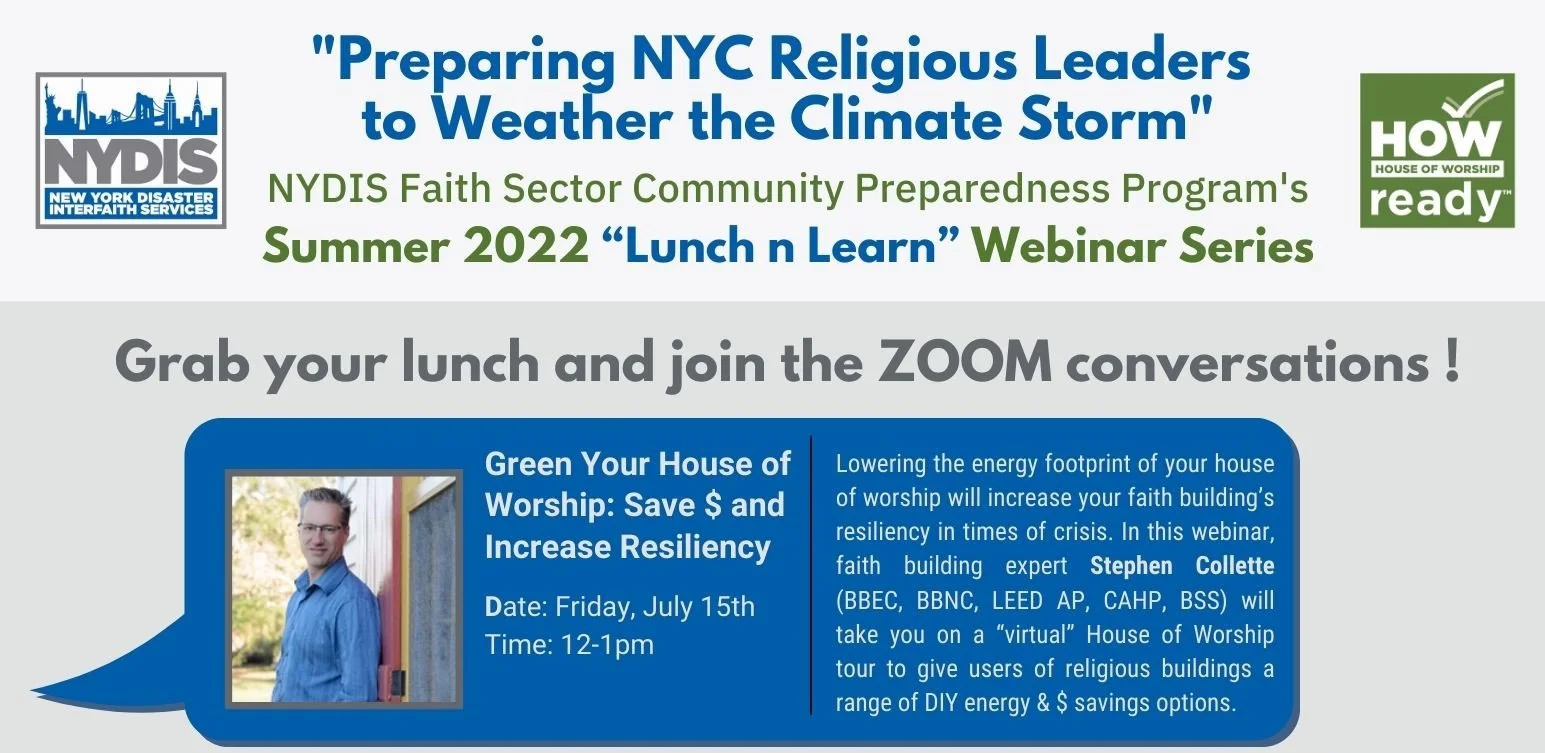 Extreme weather, ice storms, flooding, and wind events are increasing in frequency and affecting our communities on a more regular basis. The New York Disaster Interfaith Services (NYDIS) is a faith-based federation of service providers and charitable organizations who work in partnership to provide disaster readiness, response, and recovery services to New York City (NYC). Their goal is to help faith-based organizations (FBOs) in NYC be better prepared for climate disasters and able to offer support to their neighbourhoods. Recently, as part of their Faith Sector Community Preparedness Program (FSCPP) Summer 2022 ‘Lunch n Learn’ Webinar Series, I gave a talk called “Green Your House of Worship: Save $ and Increase Resiliency.” There were various non-profit and governmental organizations, and leaders from faith communities in attendance, all trying to grapple with the climate crisis and what their role would or could look like during an event, given that many NYDIS faith communities are within marginalized areas of the city with limited support in times of need.