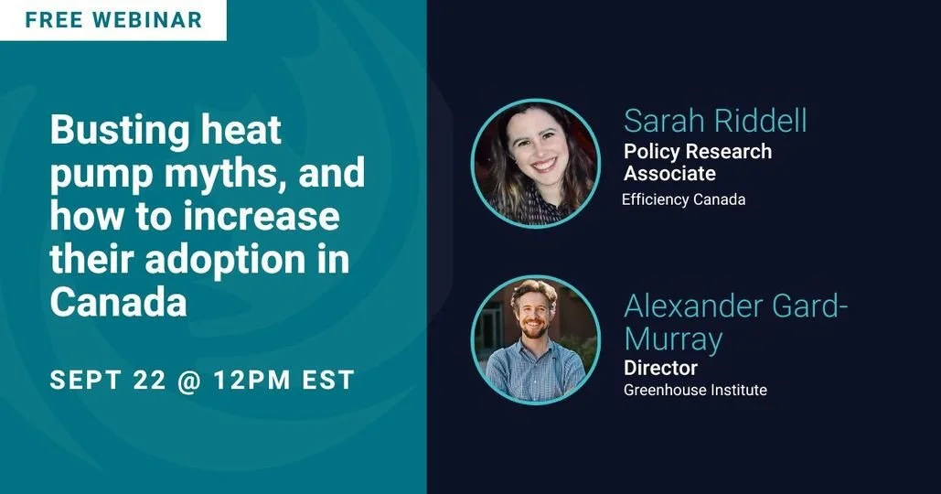 Efficiency Canada is offering a free webinar about the benefits of heat pumps and heating electrification. Sarah Riddell and Alexander Gard-Murray will go in depth about how we can use these to reduce greenhouse gas emissions. Sarah Riddell will discuss the state of heat pump policy in Canada, dispel ten common myths, and explore what policy solutions can get us much closer to widespread adoption in Canada. Alexander Gard-Murray, Director of the GreenHouse Institute and lead researcher for The Cool Way to Heat Homes: Installing Heat Pumps Instead of Central Air Conditioners in Canada, will share the new report and how this approach would result in massive benefits for Canada.