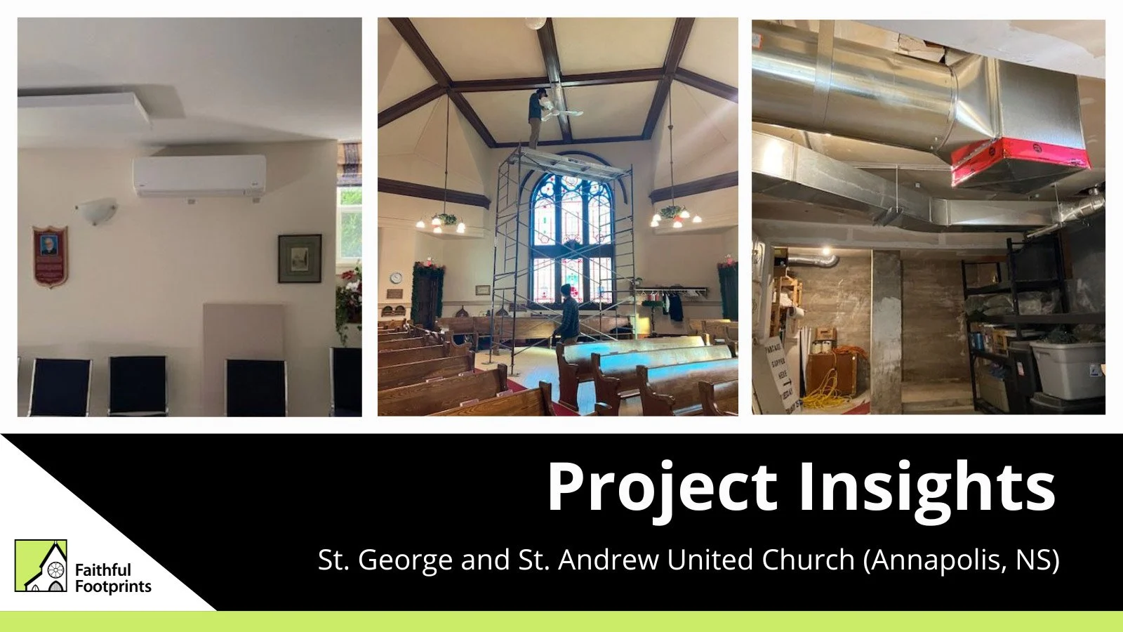 Received a grant to replace its oil burning furnaces and oil tank with three heat pumps; replace an oil fired hot water heater with an electrical hot water heater; install larger ductwork and ceiling fans; upgrade its electrical system; and insulate its sanctuary. A year following their projects, St. George and St. Andrew United reduced its weather normalized source energy use intensity by 29.3%, total GHG emissions by 13.8%, and energy costs by 34.4%.