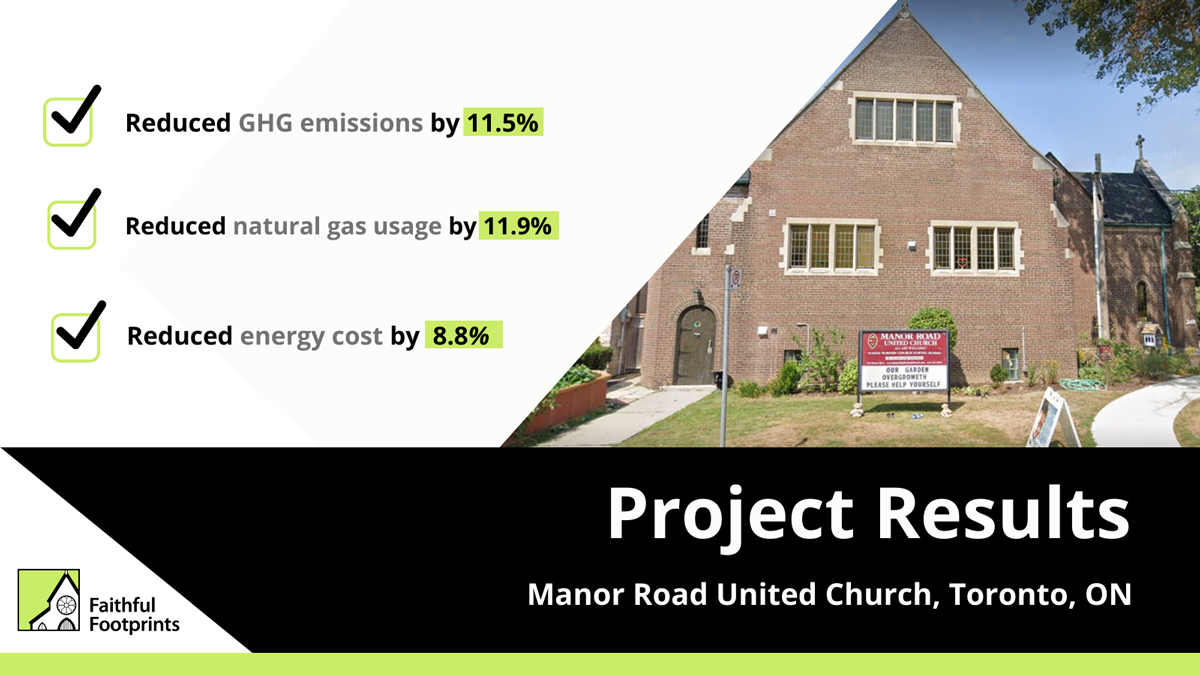 A year following their projects, Manor Road United reduced their GHG emission by 11.5%, natural gas usage by 11.9%, and energy costs by 8.8%.