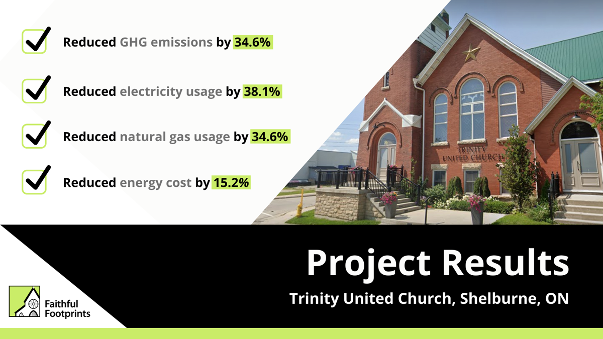 A year following their projects, Trinity United reduced their GHG emission by 34.6%, electricity usage by 38.1%, natural gas usage by 34.6%, and energy costs by 15.2%.