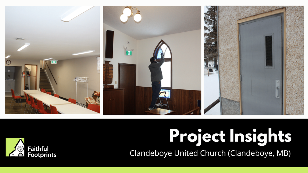 Received a grant to replace 6 emergency exits, including emergency lights; replace 19 fluorescent lights with LED lights; replace wooden back door with steel door; replace 48 bulbs in sanctuary with LED dimmable bulbs; increase attic insulation from R16 to R50; install an Eco Smart thermostat; replace hot water tank; replace 3 toilets with low flush; replace a stove with energy efficiency model; and repair 2 stained glass windows. A year following their projects, Clandeboye United did not experience any energy carbon or energy reductions, which can be due to a wide range of reasons, including variations in building use and operational demands.